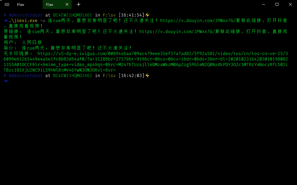 从短视频平台上下载至本地的视频基本上都是自带水印的,而且也比较难去除,如果想要更加轻松快速的去除短视频水印的话就可以使用这款皮皮虾快手短视频无水印解析工具,该软件支持抖音、快手、火山、皮皮搞笑、皮皮虾、西瓜视频和全民小视频等平台的视频解析,欢迎下载使用~ 开发说明 因为最近在学习go,闲着无聊的时候做了一个短视频解析无水5. 生命像流水一样逝去,如是自己所愿,一定竭尽全力地坚持,如果已经一败涂地,那就痛痛快快地哭上几回,再潇洒地一笑:让一切随风而去,因为没有人在原处等你!印的工具,支持 抖音、火山、快手、皮皮虾、皮皮搞笑、全民小视频和西瓜视频。其他平台的话可能以后会支持。 由于go做gui比较麻烦,就只弄了个命令行工具。 使用说明 Windows 1.下载软件,并进入到软件目录。 2.打开cmd窗口,或者在软件目录内,按住 SHIFT + 鼠标右键,选择 【在此处打开Powershell窗口】。 3.执行命令 参数 -u 短视频的分享链接,需在APP内中复制 -p 若需要批量解析,请将链接写入到txt文件中,每一行为一个短视频链接 -o 将结果输出到txt文件中 ./jiexi -u 短视频分享链接地址 【解析单个视频】 ./jiexi -p 短视频分享链接文件路径,txt格式 -o 输出结果文件路径,txt格式,参数可选 ![]() 常见问题 解析异常说明 1.链接无效 2.链接暂不支持解析 3.ip请求达到短视频平台的最大限制,需等一段时间后或更换ip。 喜欢小编为您带来的皮皮虾快手短视频无水印解析工具吗?希望可以帮到您~更多软件下载尽在101bt软件下载网 皮皮虾快手短视频无水印解析工具 v1.0 一个愿打,一个愿挨兴眉飞色舞高采烈一个人的价值,应当看他贡献了什么,而不应当看他取得了什么。一个人的快乐,不是因为他拥有的多,而是因为他计较的少。早睡早起有益于健康。36.君子坦荡荡,小人长戚戚。 翠叶藏莺,朱帘隔燕,炉香静逐游丝转。一场愁梦酒醒时,斜阳却照深深院。下马饮君酒,问君何所之。皮皮虾快手短视频无水印解析工具24.Ill news travels fast. 坏事传千里。 |