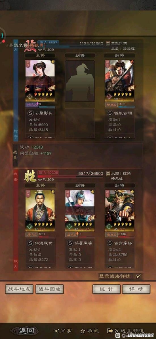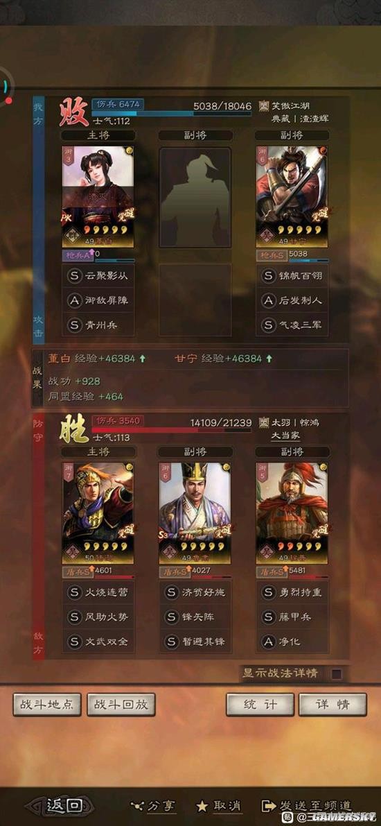 下面给大家带来的是《三国志战略版》董白甘宁双将反击流碰瓷阵容分享,只有董白和甘宁的阵容,一起看看吧! 现在主流的碰瓷大部分都是什么三势吕,吴骑,利用多段普攻,先攻优势快速输出,以达到以少量兵力碰瓷掉你主力大部分兵力,让人头疼不已。 我在贴吧内偶然见到一个周泰甘宁董白五峰阵反击队的帖子,深受启发,苦于没有周泰没有五峰阵,于是简化了一下,搞了一个精简版碰瓷队,效果拔群。 对阵三势吕吴骑基本不亏,渊骑五五开,魏法骑有点亏,这队比较怕当峰(哪有队伍不怕当峰),怕士别,怕虚弱,怕混乱,简单来说就是不能打法师队,其他的基本无视,对阵其他主流队伍也基本场均1000战功以上,不会让你满兵出门带着250战功回家。 ![]() 这队不占用啥主流战法,核心就是利用甘宁的高暴击,青州兵的反击,董白的反击,使得别人普攻打甘宁一下甘宁反击四次,这不比天下无双厉害多了,想想吕布砍我一刀我砍他四刀,他哪来的还手之力,要是配合上灼裂,伤害更加爆炸,兵书第二回合破阵,枪兵营满级后二分之一的概率给甘宁破阵,给到了伤害更加爆炸,即使是打藤甲减伤百分之40多只要出了暴击也能打掉不少血 ![]() ![]() ![]() ![]() ![]() ![]() ![]() ![]() ![]() ![]() 《三国志战略版》董白甘宁双将反击流碰瓷阵容分享黔驴技察言观色穷积蚊成雷46. 只因为这世上有河,因此就必须有两岸,以及两岸的绿杨堤。我不知我们为什么只因坚持要一条河,而竟把自己矗立成两岸,岁岁年年相向而绿,任地老天荒,我们合力撑住一条河,死命地呵护那千里烟波。如果你有什么问题和请求只管跟我说。曹操112.老骥伏枥,志在千里。烈士暮年,壮心不已。《龟虽寿》 无意苦争春,一任群芳妒。零落成泥碾作尘,只有香如故。绛帻鸡人送晓筹,尚衣方进翠云裘。三国志战略版董白,三国志战略版甘宁,三国志战略版反击流65、You never know till you have tried. |
