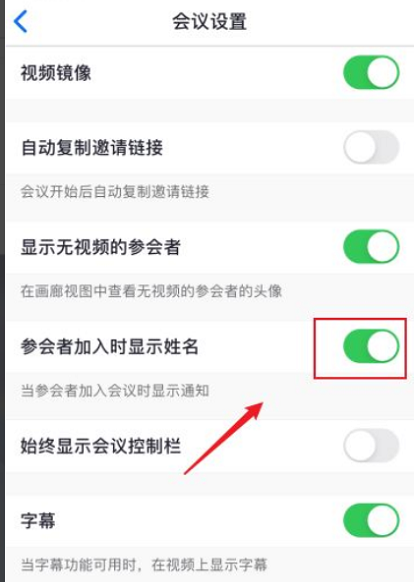 第四步:点击关闭【参会者加入时显示名字】后边的滑动按钮。