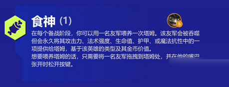 并在他的嘴巴张开时松开按键。 食神塔姆来到战场的目的非常的耐人寻味,他的目的可不是这里的高科技,而是这里的美味食物,或者说美味英雄们? 每个备战环节,你可以使用一名友军来喂养塔姆,使塔姆获得永久的攻击力、法术强度、生命值、护甲或魔抗属性的其中一项,投入的英雄越珍贵,提升的属性越高。 需要注意的是在喂养塔姆时,你需要拖动英雄悬停在塔姆上方一小段时间,等他张开嘴后再投入,操作的太快有可能会产生一些不必要的失误,推荐优先给塔姆喂食斗士、保镖这类英雄,增加塔姆的坦度来成为其他队友的保护伞。 二、协同英雄 河流之主 塔姆  上面就为大家分享的金铲铲之战s6羁绊食神有什么效果的全部内容,感兴趣的小伙伴们速来围观吧! |