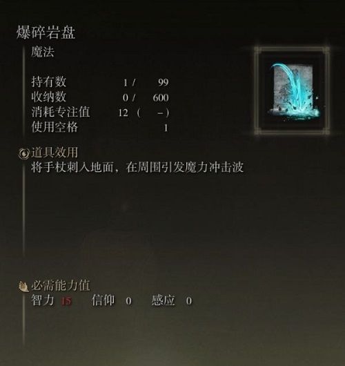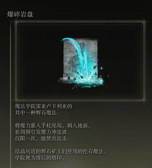 近日有一些小伙伴咨询小编艾尔登法环爆碎岩盘怎么获取?下面就为大家带来了艾尔登法环爆碎岩盘的获取方法和地点介绍,有需要的小伙伴可以来了解了解哦。 该魔法的描述如下。  该魔法的消耗及属性要求如下。  该魔法位于利耶尼亚湖【雷亚卢卡利亚结晶坑道】中。  来到下图所示位置后继续深入矿洞。  像左前方前进乘坐升降梯向下。  穿过木梁继续深入矿洞。  来到下图所示位置后进入左侧的矿洞。  在矿洞中的尸体上可以找到该魔法。  艾尔登法环游戏玩法 游戏中会有主线作为引导,但玩家随时都可以去其他地方冒险。六大区域的主线地图与作为枢纽的隙间之地无缝相连。 游戏包含城堡、墓穴、遗迹、沼泽、洞窟等场景。 游戏包含精力值设定,但总体上对玩家的影响较小。 玩家可以跳跃,以躲避敌人的攻击或探索地图。 游戏包含快速旅行系统,玩家也可以骑马探索。 游戏包含类似《黑暗之魂3》中的战技系统,但本作的战技不由武器而定,而是可以与不同武器任意搭配。 以上就是给大家分享的艾尔登法环爆碎岩盘怎么获取的全部内容,感兴趣的小伙伴们速来围观吧! |