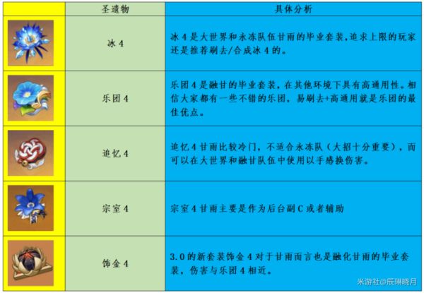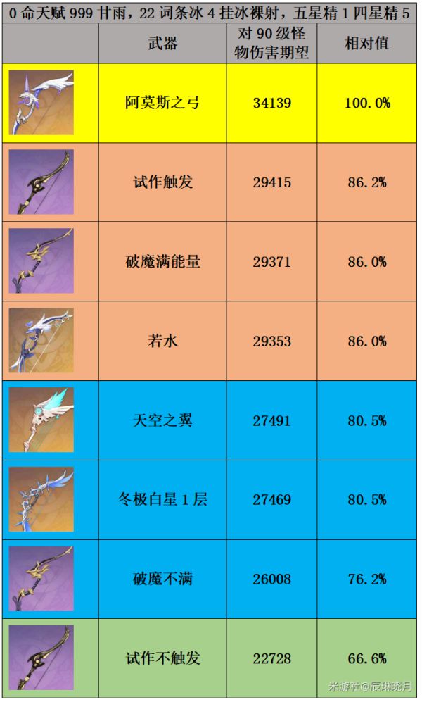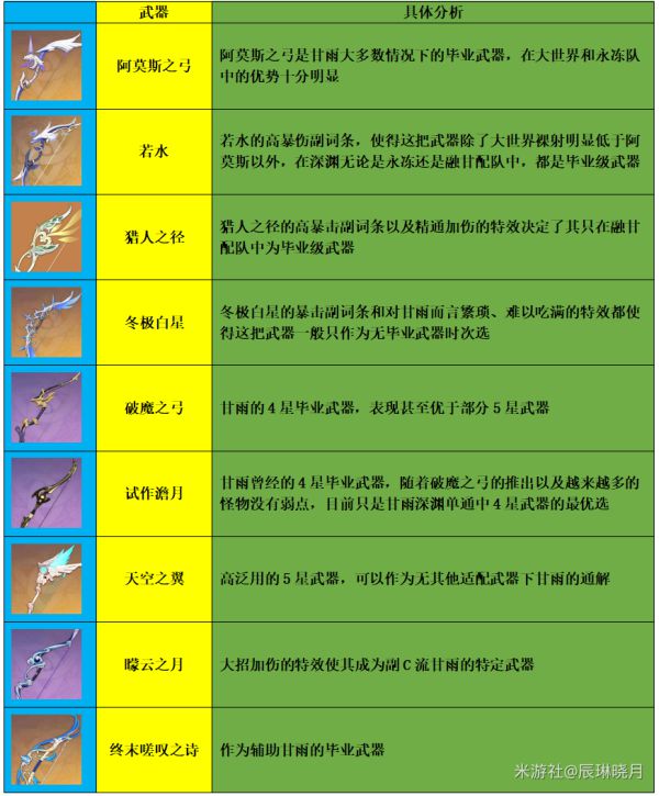 《原神》游戏里的甘雨是5星冰系角色,而甘雨也即将复刻,尽管在神里绫华登场后,甘雨在深渊的使用率有所下滑,但甘雨的表现依旧亮眼,下面请看由“辰琳晓月”带来的《原神》甘雨攻略详细介绍,包括甘雨手法讲解,武器解析,圣遗物分析以及配队攻略,希望对各位玩家有帮助。 相信很多人还是对抽取甘雨感兴趣的。作为甘雨单推人,在大世界、锄地、深渊、单通、双通中我常使用甘雨,也算有一点心得。今天我将带来一篇甘雨3.0全方位攻略,为大家全面讲解3.0版本环境下甘雨的玩法,希望可以对大家提供帮助。 ![]() 目录 1.甘雨3.0环境下的综合分析 2.甘雨命座适配武器解析(4星武器抽象伤害,1命提升) 3.甘雨适配圣遗物分析 4.甘雨手法讲解 5.甘雨深渊配队具体攻略 ![]() 1.甘雨3.0环境下的综合分析 甘雨,作为璃月3C之一,标志着原神从开服时代走入了3C时代,在当年深渊中曾以80%+的使用率表现出绝对的统治力。尽管2.0版本以来,随着深渊单体BOSS的增加以及神里绫华的崛起,甘雨在深渊的表现有所下滑,但目前而言,在日常大世界、锄地以及高难挑战中(例如单通),甘雨依旧是顶尖强度角色。 目前而言,甘雨进可作为强力主C(强于对群),退可作为冰系辅助(天赋20冰伤和4命大站加伤),电脑端和手机端都有不错的体验(手机端甘雨并不是网传的那样操作困难,单通完全没问题)。 甘雨虽已经不是当年必抽的顶级强度,但抽取优先级仍然很高。总的来说,对于不强烈追求深渊满星的萌新(甘雨确实可能比胡桃、绫华、雷神差一些)和深渊满星无压力的老玩家来说,没有甘雨的情况下,抽取甘雨都绝对会改变你的游戏体验。 2.甘雨命座适配武器解析 技能方面 甘雨主a副q,e技能看情况点。 甘雨的命座具体效果如下:1命提供减抗和回能,2命增加一次e(与6命结合效果显著),4命提供全队辅助,6命解锁速射玩法,核心命座为1、6命,停留在其余命座收益较小。满命甘雨强度较高,单通仅次于满命夜兰,大世界、锄地表现也十分良好。 ![]() 1命对于裸射重击伤害期望有14%的提升。 ![]() 武器方面 综合而言,甘雨的武器推荐顺序如下: ![]() 对于大世界单人裸射而言,阿莫斯之弓是最优选择,与其他武器差距明显。考虑到破魔之弓和试作澹月为锻造的四星武器(破魔之弓获得方式为在神无冢上方浅水区收集海螺,在海螺屋与NPC阿敬对话,开7天宝箱,在第8天,宝箱就可以开出破魔之弓的武器锻造图纸),易于获得,试作澹月需要额外命中弱点触发武器特效。故大世界一般推荐没有阿莫斯之弓的甘雨选择破魔之弓或若水。 大世界甘雨还是需要高暴击(50+)来确保稳定伤害。0命阿莫斯甘雨裸射期望过4W即毕业。 ![]() 永冻 在对群情况下,永冻配队的甘雨大招伤害也十分重要。永冻甘雨毕业级武器为阿莫斯之弓或若水。若是甘雨+绫华的双C体系,甘雨作为脱手流,曚云之月是不错的选择。 融甘 融甘甘雨主要依赖融化的蓄力箭打伤害,毕业级武器为若水、猎人之径或阿莫斯之弓,冬极白星、天空之翼与这三者的差距不大。4星武器依旧选择破魔之弓或试作澹月。 3.甘雨适配圣遗物分析 ![]() 4.甘雨手法讲解 摆烂手法:R蓄力看动作满后射箭。 懒人手法:甘雨的蓄力重击分为两段,每一段蓄力都会有明显的音效,在听到第二段音效后(或特效开始收缩时)松手即可,不需要等待完全收缩。 ![]() 但开镜蓄力会有短暂的延时,所以我们通过重新开镜解决这个问题加快速度。 故两种进阶手法为: 手法1:R蓄力+闪 重复 重置了后摇的同时闪避也可以调整身位,大大增加了灵活度,每箭频率相同,但会十分消耗体力。 手法2:长按蓄力+R蓄力+闪 手法2较手法1两箭之间的间隔更短,每组之间的间隔更大,减少了体力消耗。 比较每箭频率: ![]() 推荐实战中推荐两种进阶手法交替使用。 在永冻队实战中,由于甘雨天赋的加伤,一般都为先开q后再射蓄力箭霜华绽以达到BUFF的最大利用。 ![]() 融甘队伍中q技能作用不大,虽然有加伤,但可能打乱元素反应,可开可不开。 5.甘雨深渊配队具体攻略 永冻 莫甘娜温(莫娜 甘雨 迪奥娜 温迪) 最经典的永冻配队,对群无敌队伍,割草体验极佳,现在依旧是深渊9-11层最好用的配队之一。 武器方面,由于讨龙的长CD(20S)与18S轴不相配以及莫娜的充能问题,队伍中的莫娜一般选择携带试作金珀/证誓之明瞳(2.5活动武器),温迪选择西风弓/绝弦/终末嗟叹之诗,迪奥娜选择祭礼弓或其他充能生命武器。 莫娜充能一般需求230+,温迪充能需求一般180+。 圣遗物方面,莫娜选择千岩4或宗室4(迪奥娜不带宗室4时),温迪选择风4,迪奥娜选择2治疗+2千岩或宗室4 操作手法如下: ![]() 甘鹤万心(甘雨 申鹤 万叶 心海) 鹤万心作为目前永冻队的顶级辅助配置,在伤害方面较传统的温迪+莫娜+迪奥娜有较大提升,也是目前来说需求高DPS时,永冻甘雨的最佳配队选择。 武器方面,申鹤一般选择携带西风枪确保充能,万叶选择苍古自由之誓/西风剑/铁蜂刺,心海选择携带讨龙。 申鹤充能一般需求180+,万叶充能需求一般140+。 圣遗物方面,申鹤携带选择宗室4比2攻+2攻效果更好,万叶选择风4,心海选择千岩4 操作手法如下: ![]() 融甘 低命甘雨:甘钟香班(甘雨 钟离 香菱 班尼特) 目前而言,融甘是低命甘雨对单的最优选择,毕业级融化甘雨一箭可以20w+,其DPS充足,缺点是操作难度较大。融甘队伍的甘雨不适合带冰4,建议使用乐团4/追忆4/饰金4,最好保证200+的元素精通(