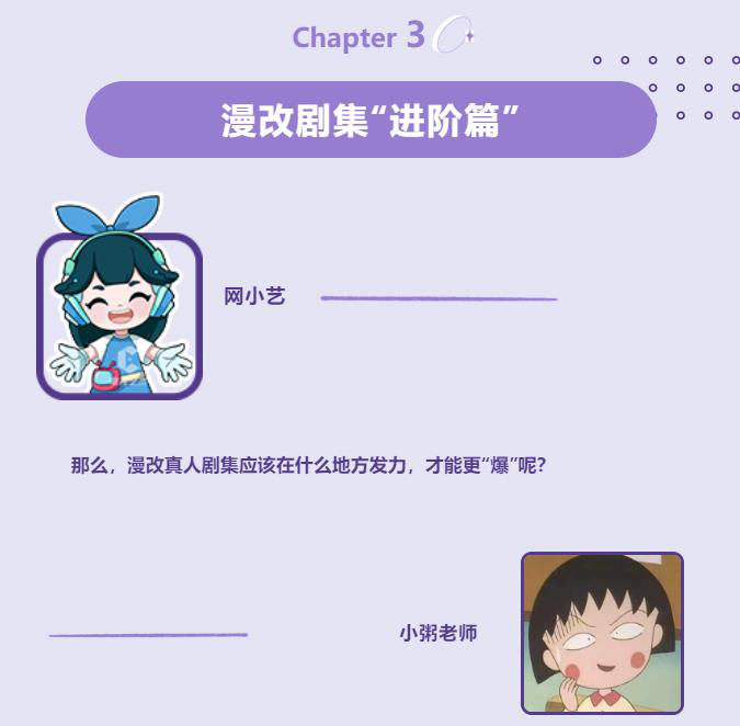 以摆脱原著在文化背景、人物塑造、戏剧冲突等方面的羁绊和限制。更好地与中国社会的主流价值观对接,创作团队做了一定的修改,比如重塑漫画主题,把主角从一个高中生换成大学生等.然而,在人物设定调整后,ACGN文化的语境差异导致了一些沙雕喜剧桥段与原著中人物的不匹配,一些搞笑的场景和人物表情,对于真人来解读是尴尬和别扭的,这使得该剧系列面临着本土转换与艺术表现、幽默与少年幼稚等冲突。最终播出效果还有待市场检验。 动漫中的很多名场面是很难被直接输出到真人端的然后就是所谓的直接“本地化”。《月刊少女野崎君》块黄磊主演的美食剧首当其冲。该剧不仅场景、服饰、叙事、桥段、分镜等与日版基本相同,故事改编也是生搬硬套,失去了原著的治愈性和情感性,深植于当地的现实社会和人间烟火,名声不佳。 没有烧烤摊、大排档和“花毛一体”,算什么中国深夜食堂?这方面,改编自日本经典同名漫画的《深夜食堂》应该更好。影片在保留原著故事结构和人物设定精髓的基础上,进行了合理的创作,以适应中国国情。它巧妙地将青春热血与时代背景联系起来,刻画了主要人物的成长与蜕变,展现了围棋少年在追梦路上的群体形象,弘扬了顽强拼搏、友谊团结的体育精神。 《棋魂》的成功不仅在于其对原作的尊重,更在于其在中国文化背景下的创新。制作团队在“抄作业”和“魔改”之间找到了合理的路径,从而克服了海外IP最容易出现的“水土不服”问题,向市场展示了正确的打开方式。第二,“宜颜”和颜值表现的尺度不同于文学,动画具有更直观的视觉效果,其中人物形象、表情、行为的呈现是重要的一环,也成为了漫画剧最具辨识度的风格标签。在这里,需要把握好“宜颜”和颜值的表现尺度。“宜颜”:起源于日语,通常用于表现人物夸张或扭曲的表情变化,处于真人随意演绎的巅峰。其中,对力度的掌握是核心,需要演员准确处理从二次元向三次元转化的尺度。做的好的话,会打通二次元的墙,以喜剧效果快速出圈,晋级表情包的C位;如果做不好,一些恶搞鬼畜、二度脱离排行榜的设定,会给人过时、夸张的感觉。 日剧颜艺巅峰:半泽直树 国剧颜艺巅峰:容嬷嬷颜值:古装甜宠、奇幻童话等美女类动漫,以各种不同寻常的造型满足观众对理想人物的想象。在这类剧中,颜值表现往往取代传统表演技巧,成为角色选角的主要标准。在一些二次元观众看来,人物设定的魅力远不止剧情本身。他们执着于外貌、衣着、身份,却不在乎叙述带来的体验。以上操作放大了二次元受众的虚拟特性,更看重下面粉丝经济和偶像利益带来的巨大商业价值是不可取的。 主角是一只猫的漫画 《棋魂》 也被改编为真人网剧,演好纸片人不叫好,有本事你演好喵星人。如何利用好二次元的艺术表达方式来消解严肃性,既保留动画的精髓,又使其符合大众传播视听艺术的规范,这是漫改剧改编需要关注的第二个重点。 首先,找准题材。受网络文学创作惯性的影响,现有作品的题材大多集中在都市青春校园和古装玄幻武侠。如何创新转型,使其内涵和外延不断拓展,实现与现实世界的链接和价值共振,这就是问题所在
