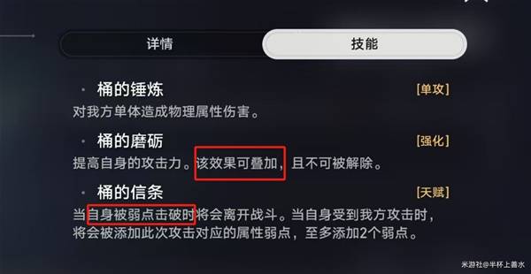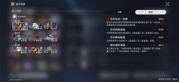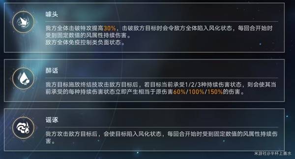 《崩坏星穹铁道》2.6版本虚构叙事论黄数黑其四用什么阵容比较好呢?下面请看由“半杯上善水”为大家带来的《崩坏星穹铁道》2.6论黄数黑其四敌人分析与阵容推荐,希望可以帮助到大家。 关卡BUFF 收到持续伤害(DOT)提高35%,受击后行动提前35%,敌方DOT状态下造成伤害下降35%; ![]() 增益效果 噱头:我方全体击破特攻提高30%,击破敌方目标时会令敌方全体陷入风化状态,每回合开始时受到固定数值的风属性持续伤害。 敌方全体免疫控制类负面状态,冰属性击破的冻结、虚数属性击破的禁锢、量子属性击破的纠缠无效; 醉话:我方目标施放终结技攻击敌方目标后,若目标当前承受1/2/3种持续伤害状态,则会使其当前承受的每种持续伤害状态立即产生相当于原伤害60%/100%/150%的伤害。 类似卡芙卡的战技效果,立即结算伤害。 谣诼:我方攻击敌方目标后,会使目标陷入风化状态,每回合开始时受到固定数值的风属性持续伤害。 ![]() 对敌分析 节点一 ![]() 第一波 主要敌人:【醉于盛会的此刻】 ![]() 关键点:施加【荒宴醉】和【欢宴罪】负面debuff状态 ![]() 【荒宴醉】一定回合内,每回合开始时受到风属性伤害,该效果可叠加 【欢宴罪】一定回合内,每回合开始时受到雷属性伤害,该效果可叠加 【为你洗去一切罪】引爆持续伤害(立即结算持续伤害,类似于卡芙卡的战技),同时会把持续伤害效果解除; 应对策略:蓄力阶段尽快击破弱点,带净化的生存为尽可能减少持续伤害扣血 第二波 没有精英怪,注意王下一桶击破弱点即视为击败,群伤的时候优先打他,叠加攻击层数高了踢人还是很痛的,尤其是受击后还会行动提前,注意血量避免猝死; ![]() 第三波 主要敌人:布洛妮娅 ![]() 关键点: 布洛妮娅单独出来其实威胁不大,毕竟辅助属性为主,她和可可利亚一起才是噩梦,尽快击破弱点击杀即可。 节点二 ![]() 第一波 主要敌人:【蚕食者之影】 ![]() 关键点: 破韧 技能解析: 主要就是一个核心技能:【黄金年代的绸缪】 使自身进入蓄力状态并获得9层【追忆刻度】,下次行动施放【黄金年代的解放】。每次受到攻击后失去1层【追忆刻度】 应对策略: 快速破韧即可让【追忆刻度】失效,9层都打掉比较难,利用追击队可以(还有一个成就可以拿) 第二波 没有精英怪,注意王下一桶击破弱点即视为击败,群伤的时候优先打他,叠加攻击层数高了踢人还是很痛的,尤其是受击后还会行动提前,注意血量避免猝死; ![]() 第三波 主要敌人:【彦卿】 ![]() 彦卿本身比较厉害的是技能【燕归来】,但是由于虚构叙事小怪会一直刷新,没有空余位置让彦卿放置飞剑,关键点还是一直会刷新的【蚕食者之影】。 《崩坏星穹铁道》2.6论黄数黑其四敌人分析与阵容推荐水流湍沧海一粟电劈石击急14. 有一种缘分叫做似水流年,有一种宿命叫做碧海青天,假如爱有天意,可否让我在云水深处,与你再次相逢,陪你一起笑看陌上的花开花落,静观天边的云卷云舒。你的如花笑靥,渲染了我的似水流年。孩子们都有很大的潜能,而父母却没有意识到这一点。399.牢骚太盛防肠断,风物长宜放眼量。《七律?和柳亚子先生》 减安木兰花 秦观衣裳已施行看尽,针线犹存未忍开。崩坏星穹铁道论黄数黑其四阵容推荐,崩坏星穹铁道论黄数黑其四敌人分析,崩坏星穹铁道2.6论黄数黑其四61、The worse luck now, the better another time. |