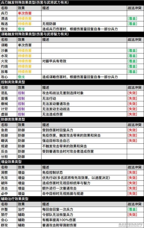 今天为大家带来的是《三国志战略版》游戏机制解析,来看看大神总结的新手攻略吧! 游戏概念 讲几个很基本,但容易碰壁的概念。 行军与调动 很多朋友,当然也包括我自己。刚进游戏,是不明白行军与调动有啥差别的。 行军 基本上所有地块都可以有行军指令(不可移动的除外)。 可以使自己的部队朝目标移动,随着距离不断消耗士气,速度为正常速度。 移动过程中可以取消,若点击中止,将会停留在当前位置。遇敌产生战斗。 移动到目的地时,会站在目的地停留。 调动 营帐、关卡、城池上有这个选项。 可以使自己的部队,不消耗士气、并且双倍速度地朝目标移动。 移动过程中无法取消,若点击中止,将会进入撤退状态,不可逆转。遇敌产生战斗。 移动到目的地时,部队将进入目的地。 战法优先顺序 游戏中的尚书台有比较详细的说明,直观并且明了,在这里我就借花献佛啦。战法会按照优先度,来先后发动,如果优先度相同,那么就会比较武将之间的速度来决定先后发动顺序。(同时,先攻与遇袭,这两个状态也能够对发动顺序产生改变) ![]() ![]() ![]() ![]() ![]() ![]() ![]() 除此之外,游戏还有持续性状态(dot类伤害等),如中毒、灼烧,以及控制类效果,由于内容比较多,建议朋友们自行去游戏中查阅,具体可以进游戏的尚书台搜索~(尚书台用法见下文) 尚书台 游戏中的尚书台,是个非常实用的游戏内查询工具,具体使用方法如下: ![]() 点击好友 ![]() 在好友中,上面红框三处均可以输入内容查询。 ![]() 输入内容查询后,就会跳转到这个界面,咱们尚书台的“诸葛军师”会给予回答。 战法冲突 借一张图,此图出处贴吧吧主常山赵子龙,实际出处似乎是另一位大佬。一图简单明了地阐述了战法冲突之间的关系,因此贴出来给大家随时查阅。 ![]() 内政 对于新朋友而言,内政武将的选择也是比较头痛的,尤其是在武将不全的时候。我先给大家展示一下大号的内政天团,以下配置,基本就是当前版本最新赛季的最优解了。 主政,有张昭(资源向)、曹丕(建筑向),两个选项,见仁见智,个人比较倾向于张昭走资源路线(当然,也可以在升建筑的时候,把曹丕换上,点了建筑再换回来)。 粮草、驯马,目前就这两项内政,没有橙卡自带有加成效果,因此上了政治爆表的荀彧(可惜只是内政将)、以及魅力爆表的小乔(也有人用紫卡驯马,但个人比较倾向于属性)。 寻访,这个必须要讲讲,一般来说司马徽肯定是最佳选择,但是玩家朋友们总是智计百出,我也见过刘禅寻访出诸葛的(还有用死士来寻访的),这个骚操作,反正也没有得到过证实,使用与否,也是见仁见智(个人比较钟爱司马徽)。 ![]() 那么集齐这些武将,也非一日之功,并且有些武将是后面赛季出的。所以对于咱们新手来讲,就必须要讲一下替代的问题。在游戏之初,一般蓝卡的内政将就可以满足最基本的内政需求了。比如四个资源,都分别有1个直接增加产量、1个增加屯田产量的内政将。获取到了对应内政效果的武将,就将其锁起来,把红点吃满安排上。等到日后,有了更强力的紫卡、橙卡内政将,再拿出来替换即可。 具体内政都有哪些卡,我这里就不赘述了,大家游戏内自然就可以发现。唯一要提的是,一张紫卡:糜竺,这张内政卡的获取是相对比较难的(不过游戏开始好像是送了一张),这张卡在游戏前期,个人觉得是顶尖的内政选手,各位新手朋友们,千万不要拿去分解了。 《三国志战略版》新手攻略 游戏机制解析掩耳夜色改朝换代迷人盗铃10. 生活中能够没有诗歌,但不能没有诗意;行进中能够没有道路,但不能没有前进的脚步;工作中能够没有经验,但不能没有学习,人生中能够没有闪光,但不能有污迹。39. Li Yue has been awarded the title of“Star Student of the Week” for what she did for our class. (2010.浙江)陈寿《三国志》118.士别三日,即更刮目相待。 昭君不惯胡沙远,但暗忆、江南江北。想佩环、月夜归来,化作此花幽独。唯见林花落,莺啼送客闻。三国志战略版新手攻略,三国志战略版游戏机制24.Ill news travels fast. 坏事传千里。 |