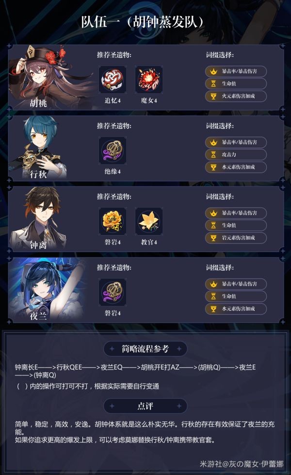 《原神》夜兰已经正式上线,她能够胜任队伍的辅助或者输出的位置,想要了解配队思路的话请看下面“灰の魔女·伊蕾娜”带来的《原神》夜兰阵容搭配解析,希望能够帮助大家。 配队思路 在考虑夜兰的配队之前,我们首先要了解夜兰的几大特点 1.夜兰的后台输出兼挂水能力非常卓越,而前台输出能力相对孱弱 2.天赋·妙传随心是一个非常通用且强力的辅助增伤技能,对许多岩/风/物理输出提升不俗 3.单水的情况下0命夜兰有很大充能压力 由于夜兰的特点3,我们首先要保证大招的充能续航问题,分两种情况: 单水夜兰 定位上更侧重辅助增伤,选用充能武器(终末弓,落霞,祭礼弓,西风弓等)+充能沙漏保证续航(充能足够可以换生命沙漏),通用的单人增伤插件,在多数队伍中都能有不俗的发挥。 双水夜兰(夜兰+祭礼行秋) 定位上兼顾输出和增伤,武器选择可以大胆追求伤害(若水,苍翠猎弓,弹弓等),泛用的双水后台组合,在许多队伍中都能有不俗的发挥。解决充能问题之后,可以思考具体配队了。 目前有三个主流方向: 以”水火蒸发反应“为核心 基础架构是一个前台火C+夜兰,剩下两个位置可以任意搭配。 对玩家box的配置要求较低,性价比高。笔者心中综合强度最高的夜兰配队。 强调夜兰的辅助增伤能力 基础架构是一个风/物理/岩C+夜兰,剩下两个位置根据主C灵活选择。 风/岩/物理系的输出能享受到的增伤很有限,变相放大了夜兰的增伤效果。以优菈为首的配队思路有不低的强度,但是距离T0队伍雷国,雷九万班,神鹤万心等仍有差距。 以“水元素伤害”为核心 基础架构是夜兰+行秋+万叶+任意一个前台驾驶员。通常这个角色是心海(因为需要奶)。 最大的特点是操作简单无脑,可以用来抬一些你喜欢的真爱角色。缺点也很明显,伤害一般,提升主要靠夜兰命座。此外,拆了3个T0(国家队,雷九,神鹤)队伍,成本不是一般得高。 PS:如果你有满命夜兰的话还是可以考虑组个纯水队夜兰自己当主C玩玩的。 队伍参考 ![]() ![]() ![]() ![]() Q1:我觉得夜兰进雷国队也很强啊,为什么没有提到呢? A1:夜兰肯定是可以进雷国的。但是考虑到技能持续时间和冷却时间的问题,在对轴方面行秋是更适配雷国的选择。夜兰替代行秋进雷国严格意义上其实多少有些“负优化”的意思,因此不是很推荐。 《原神》夜兰阵容搭配解析 夜兰队伍怎么搭配嬉皮一干二净笑美如冠玉脸27. 在英文散文发展顺利的时候,不仅文学家能写好散文,各界都能出现散文能手,全社会都关心语言质量。我衷心感谢你为我和我家人所做的一切。181.丹青不知老将至,富贵于我如浮云。《丹青引赠曹将军霸》 门隔花深旧梦游,夕阳无语燕归愁,玉纤香动小帘钩。远梦归侵晓,家书到隔年。原神夜兰阵容搭配,原神夜兰队伍搭配,原神夜兰配队40、Desire has no rest. |