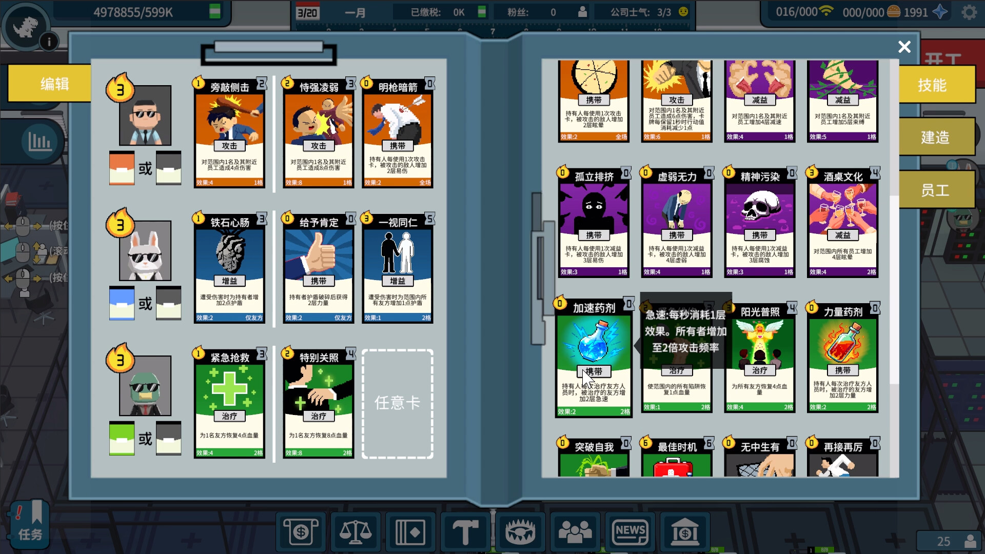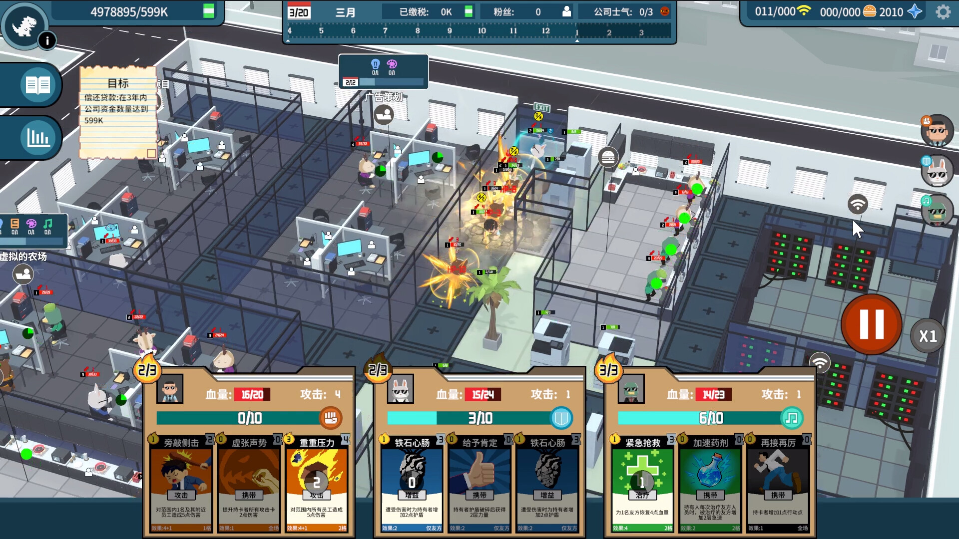 进入一整年的工作阶段,玩家通过激活老板和管理层员工身上的技能卡自动攻击耗尽精力想要逃跑的员工,使他们失去反抗意志并回到工位继续加班。使用技能卡会消耗行动点数,当行动点数被消耗时,每1秒恢复1点行动点数。